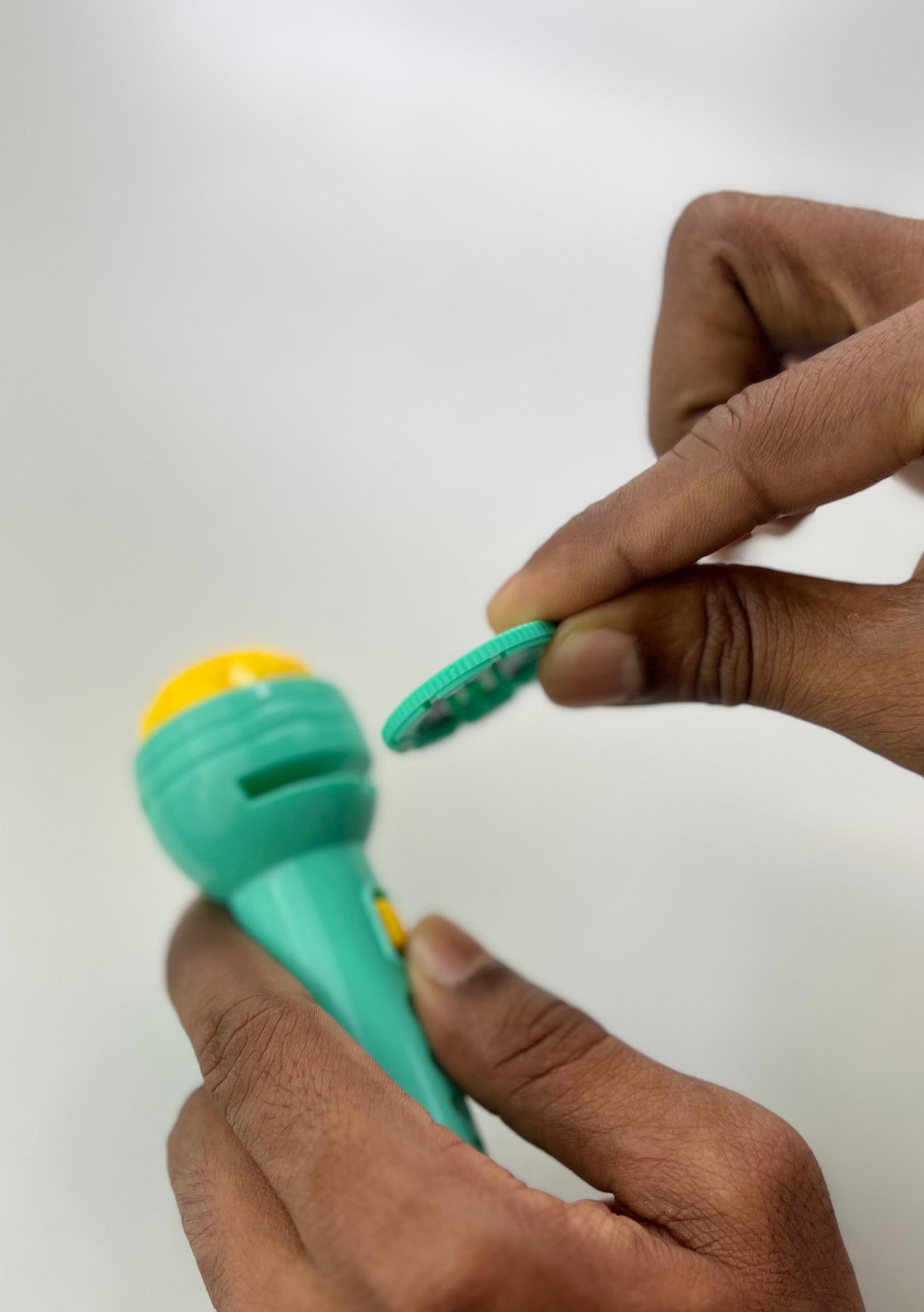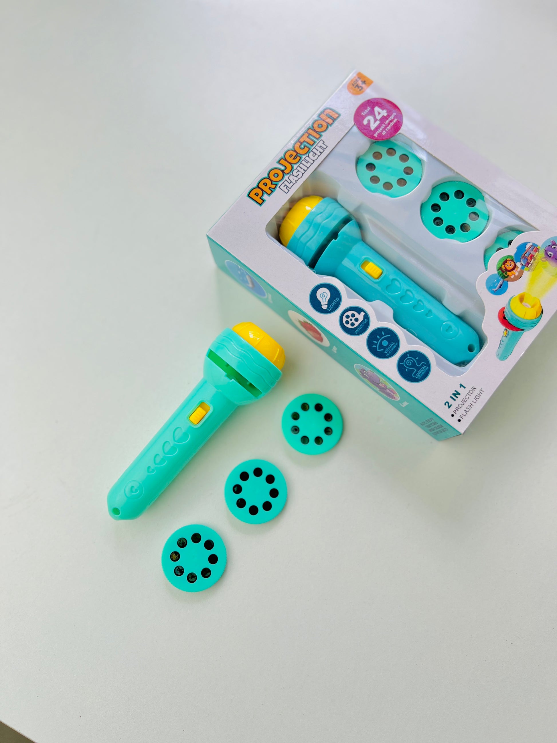 This is a projection flashlight for children. It can project various images on the wall, making it great for bedtime stories or learning about animals. It can also help with their imagination and visual skills. Would you like to know more